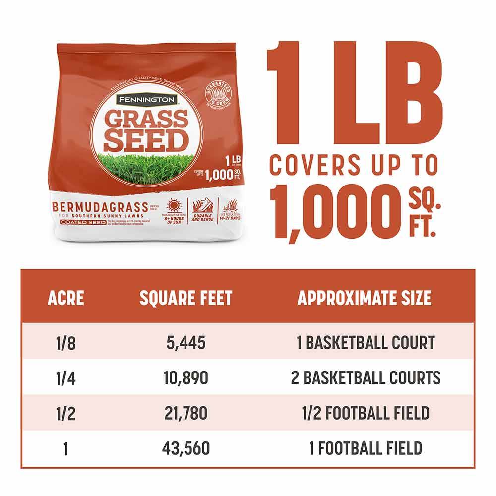 This grass seed will thrive in lawns that receive 8+ hours of daily sun. Plant it in the spring or early summer and see results within 14 to 21 days. A 1-pound bag covers up to 1,000 square feet for overseeding an existing lawn and 500 square feet for starting a new lawn from scratch.