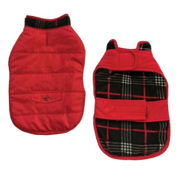 Style meets performance in this sporty red parka lined with rich plaid fleece. Dogs can face the elements in style wearing this attractive jacket.