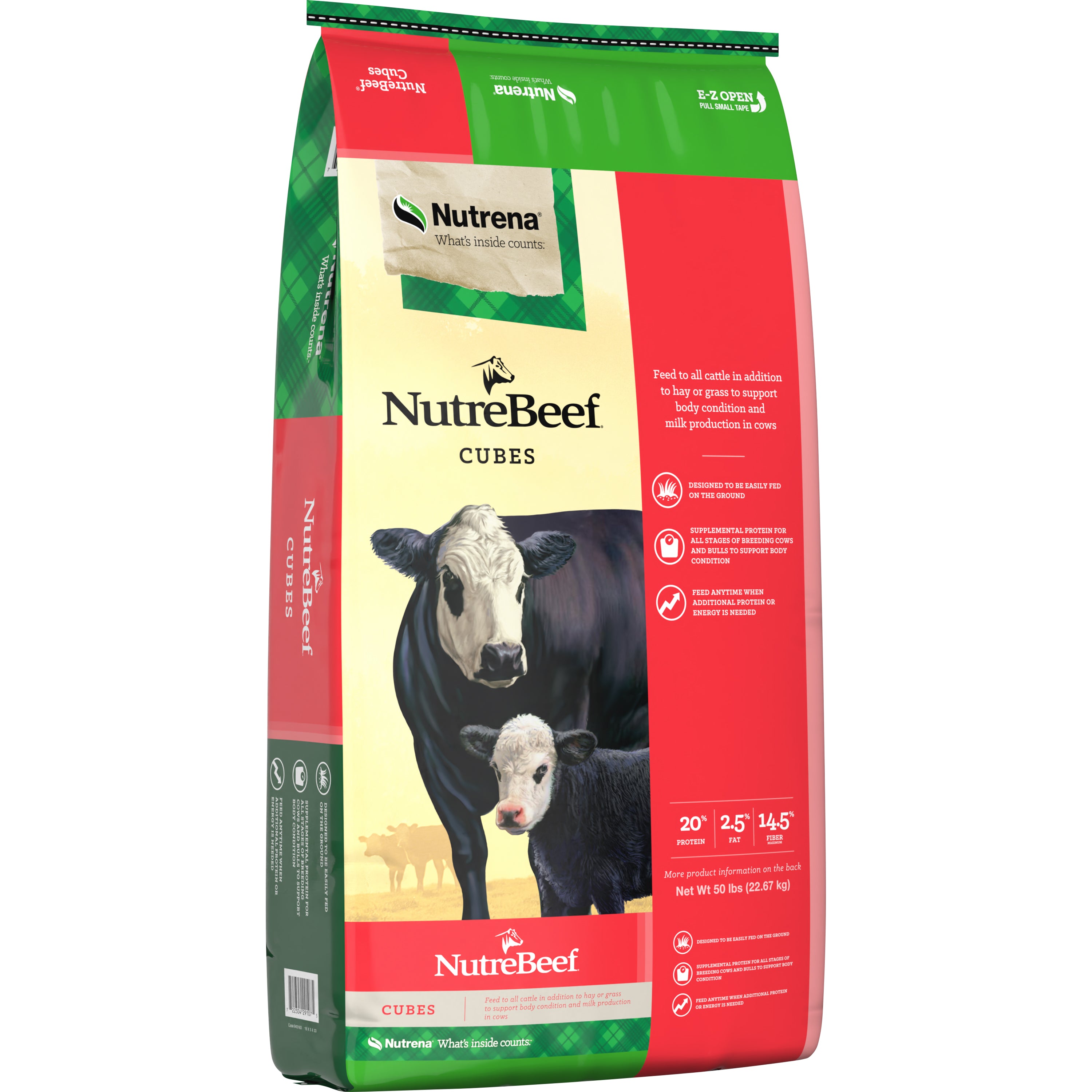 These 50-Pound Nutrebeef Cubes from Nutrena are dense, high-protein feed cubes designed for livestock owners who need a convenient supplemental protein source. Formulated for easy feeding on the ground, they provide supplemental protein for all stages of breeding in cows and bulls and can be offered any time animals need extra protein or energy. With a guaranteed analysis of 20.0 percent crude protein, up to 14.5 percent crude fiber, and 2.5 percent crude fat, these cubes help support body condition, lactation and recovery during demanding seasons. Use them to top off pasture nutrition in spring and summer, boost intake during winter feed shortages, or as a targeted supplement around breeding and calving to maintain reproductive performance and overall herd health.