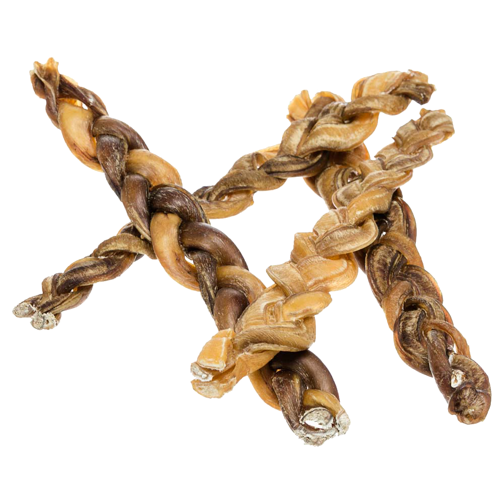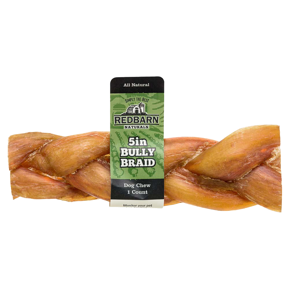 5-Inch Braided Bully Stick Dog Treat helps support dental hygiene and muscle development. Perfect for light, moderate or power chewers.