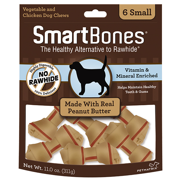SmartBones have all the benefits of a rawhide chewWITHOUT the RAWHIDE! NO RAWHIDE SmartBones are made with REAL PEANUT BUTTER, CHICKEN and wholesome VEGETABLES for a scrumptious taste dogs cant resist!