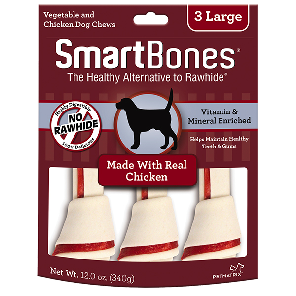 SmartBones have all the benefits of a rawhide chew WITHOUT the RAWHIDE! NO RAWHIDE! SmartBones are made with REAL CHICKEN and wholesome VEGETABLES for a scrumptious taste dogs cant resist!