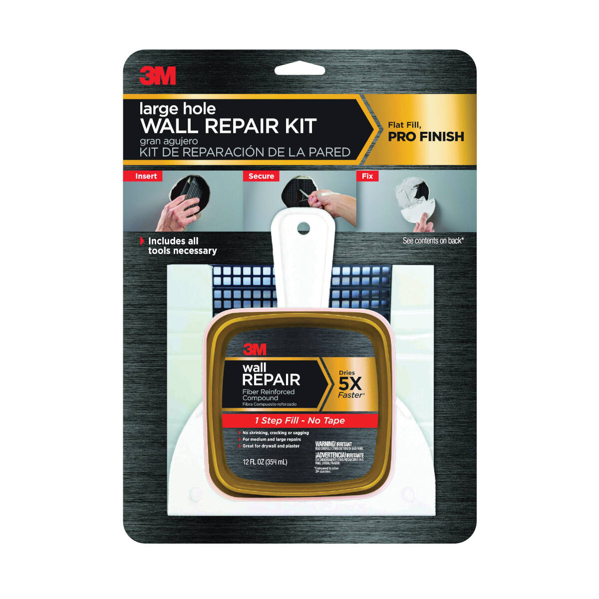 The 3M™ large hole repair kit helps you get the flat fill for a pro finish. Unlike mesh screens that can leave lumps on the wall, this product uses an innovative behind-the-wall back plate for a flat fill that generates the same results as hiring a professional. Tools include back plate, fiber-reinforced compound, putty knife, tape and sanding sponge.