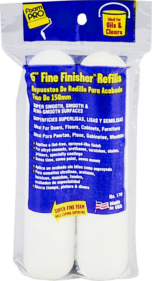 For bathrooms, kitchens, doors, floors, closets, and cabinets. For oils, clears, and enamels. For super smooth, smooth and semi-smooth surfaces. Doesn't leave unsightly fuzz, lint or seam marks. Foam conforms to surface irregularities and provides contourcoverage. Will not "mat down". Has a "reservoir action" and carries most of the paint below the surface in thousands of tiny open cells. Less frequent "dipping" and less "spreading out" of paint. Cleans quickly and easily. 2-PACK - FOAM FINE FINISHER 6" Length - Polybagged Nap Size In=3/8 Type Surface=SM/SSM
