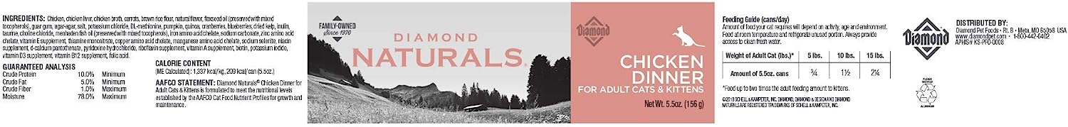 Real chicken is the number one ingredient in our Diamond Naturals Chicken Dinner, providing your cat with high-quality, lean protein for energy and ideal body condition. Enhanced with vitamins, minerals and superfoods such as pumpkin, quinoa, cranberries and blueberries, this easily digestible canned formula is designed to meet the everyday needs of your cat.
