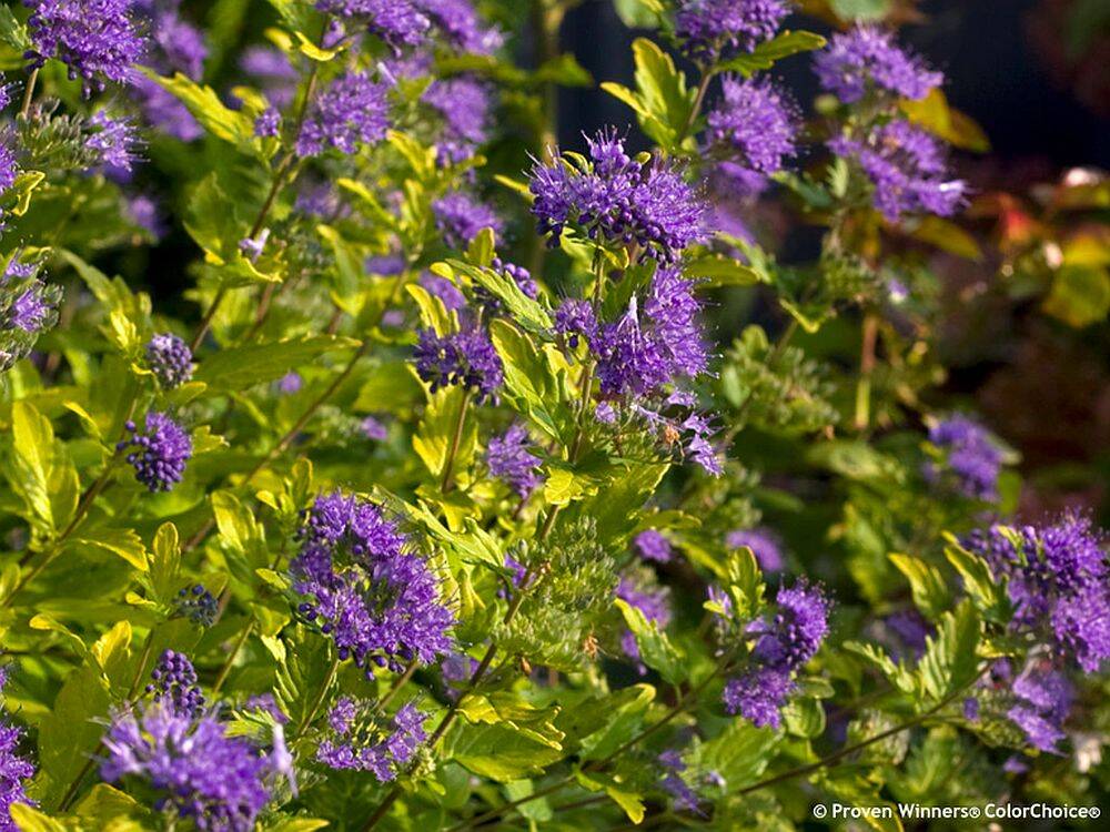 Sunshine Blue II is a new, improved variety of the classic Sunshine Blue, but it's much more tolerant of cold climates. If you've had trouble with bluebeard surviving winter in your area in the past, now's your chance to enjoy the vivid gold foliage and blue blooms of this late blooming favorite. An excellent plant for attracting pollinators!