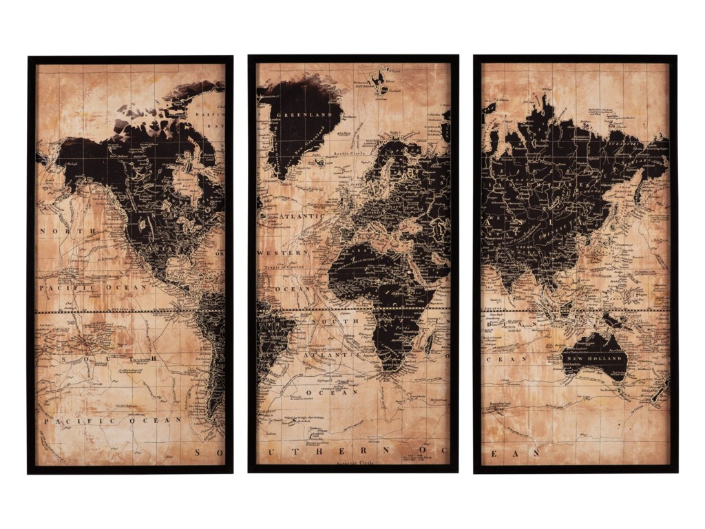Continental divide. This 3-piece world map art work marks the spot for world-class style. Gallery wrapped canvases are punctuated with striking black frames, with mounted brackets for easy hanging.