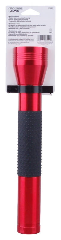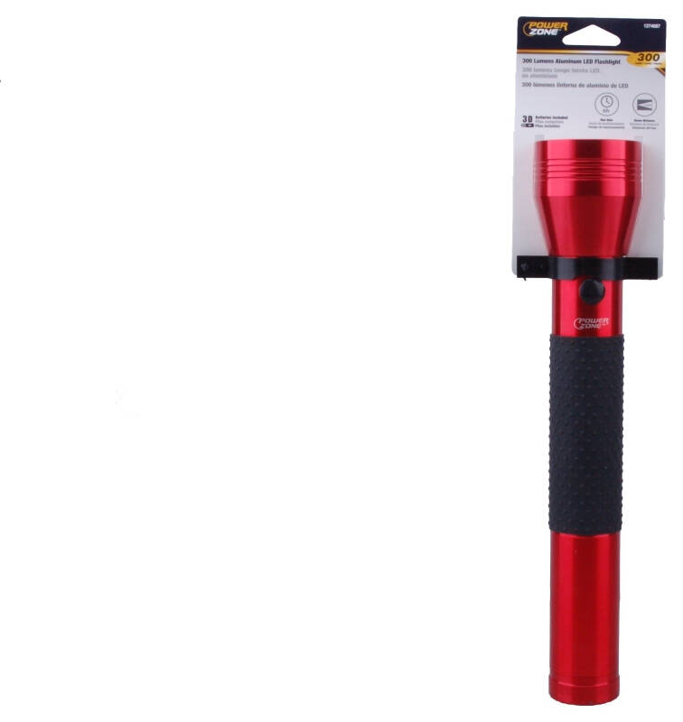 Aluminum LED flashlight is water-resistant and has simple push button operation. Rubber sleeve provides a firm grip. 300 lumens. Powered by 3 D batteries included.