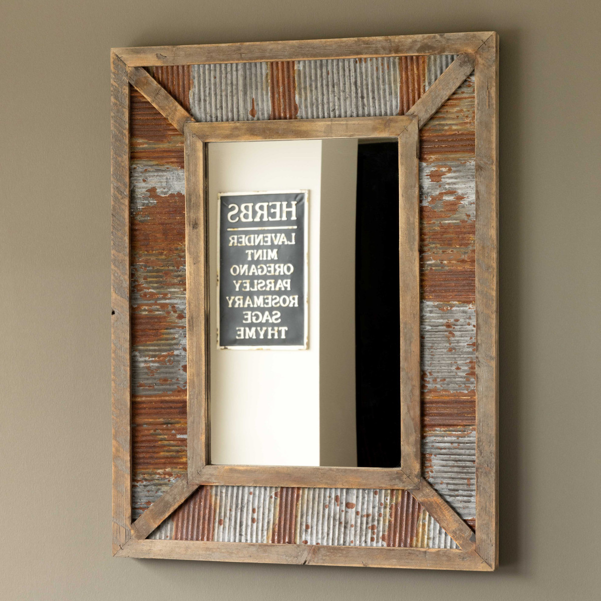 Inspired by barn salvage, this barn parts mirror is constructed from reclaimed wood and aged corrugated metal.