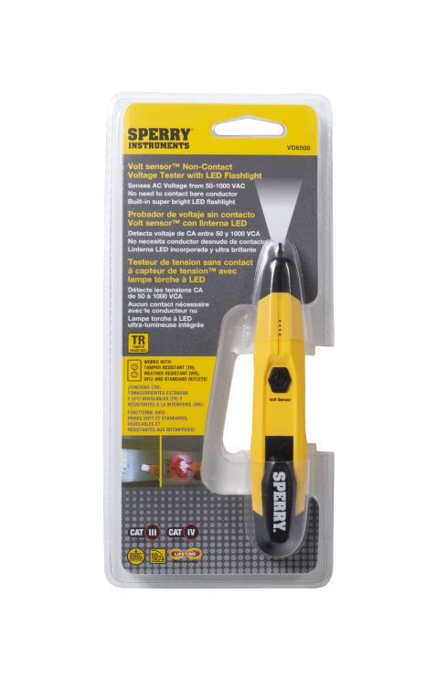 A non-contact voltage tester serves as a key component in any electrical toolkit, allowing the user to verify the presence of AC voltage prior to working on an electrical installation or during troubleshooting without requiring physical contact with live electrical conductors. Engineered to specifications required by professional electricians the Sperry Instruments VD6508 Non-Contact Voltage Detector features both audible (beeping) and visual (360° flashing red light) indicators to alert the user of the presence of AC voltage from 50V to 1000V. It also includes a built-in flashlight. The fully insulated probe tip eliminates the risk of contacting live electrical wires while the patented battery check feature designed into the unit ensures tester and batteries are operating properly, virtually eliminating false negative readings. This unit features 250lb crush-rated impact resistant ABS housing to withstand tough applications while the design ensures a positive user experience over long hours of repeated use. Applications include quickly locating hot terminals in receptacles, pinpointing breaks in wires and detecting the absence/presence of voltage at outlets, circuit breaker panels, light fixtures, switches, and motors. The unit includes a pocket-clip for secure portability. Tester is cETLus Listed, CE Certified, CAT III 1000V/IV 600V rated, and includes a Limited Lifetime Warranty. Operates from a single AAA battery (included). Frequency: 50-60Hz