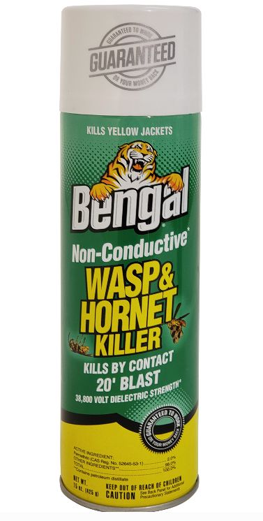 Bengal Non-conductive wasp and hornet killer is solvent-based with 2 percent synthetic pyrethroids to provide an instant knockdown kill. For outdoor use on wasps, hornets and yellow jackets. Safe for use on electrical equipment up to 38,800 volts. Solventbased for maximum knockdown. Blast reaches nests more than 20-ft. above ground. Kills by contact. Contains the active ingredient: Permethrin (2.0 percent). NON-CONDUCTIVE Size Oz=15