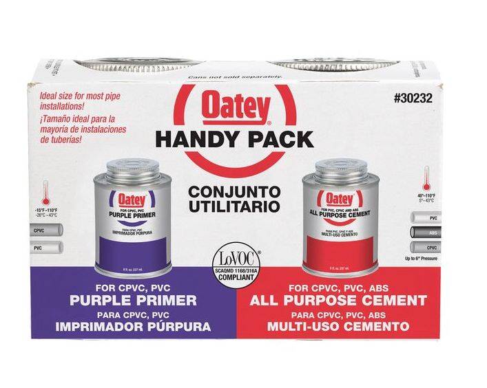 Oatey® Purple Primer and All-Purpose Medium Cement Handy Pack provides everything you need for a seamless solvent weld in a convenient two-pack. The handy pack includes Oatey Purple Primer, an aggressive primer that removes surface dirt, grease and grime while softening the pipe surface to prep for welding. Its purple tint allows for visible verification that a primer has been used, which is ideal for areas where plumbing codes require it. The medium body all-purpose cement is designed for use with ABS, PVC and CPVC pipe and offers excellent gap-filling properties. All Oatey solvent cement and primer products are certified to UL Greenguard Gold. Oatey products have earned the trust of plumbing professionals for over 100 years.