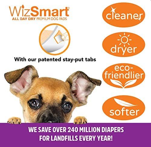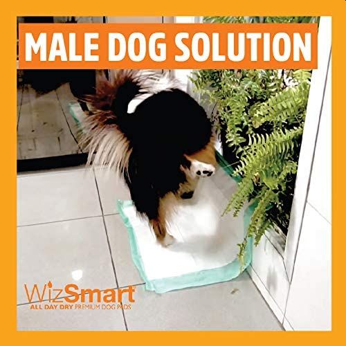 - ADHESIVE PUPPY PADS - Put down once and you will see the WizSmart difference. No more pads being shredded and dragged across the room. The 4 patented "Stay Put Tabs" secure the pad to the floor and protects your home. The adhesive strips also allow you to secure the pad to the wall at a 90-degree angle to provide a natural male dog peeing stance.