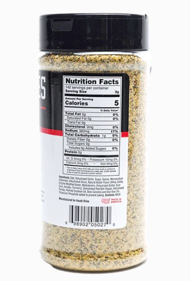 | Ingredients | Salt, sugar, dehydrated garlic, dehydrated onion, spices, monosodium glutamate, butter flavor (maltodextrin, modified butter oil, dehydrated butter, guar gum, sodium bicarbonate, annatto and turmeric), dehydrated red bell pepper, dehydrated parsley, refined soybean oil, beta carotene and less than 2% tricalcium phosphate added to prevent caking. |