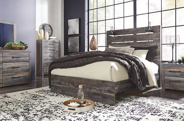 When merged in just the right way, rustic and industrial styles can make one happy marriage. Case in point: the Drystan queen panel headboard. A refined take on barn board beauty, its complex, replicated wood grain showcases hints of burnt orange and teal tones for a sense of weatherworn authenticity. Love to read in bed? You're sure to find the pair of retro-chic light sconces and USB plug-ins on the open-slat style headboard such a bright idea.