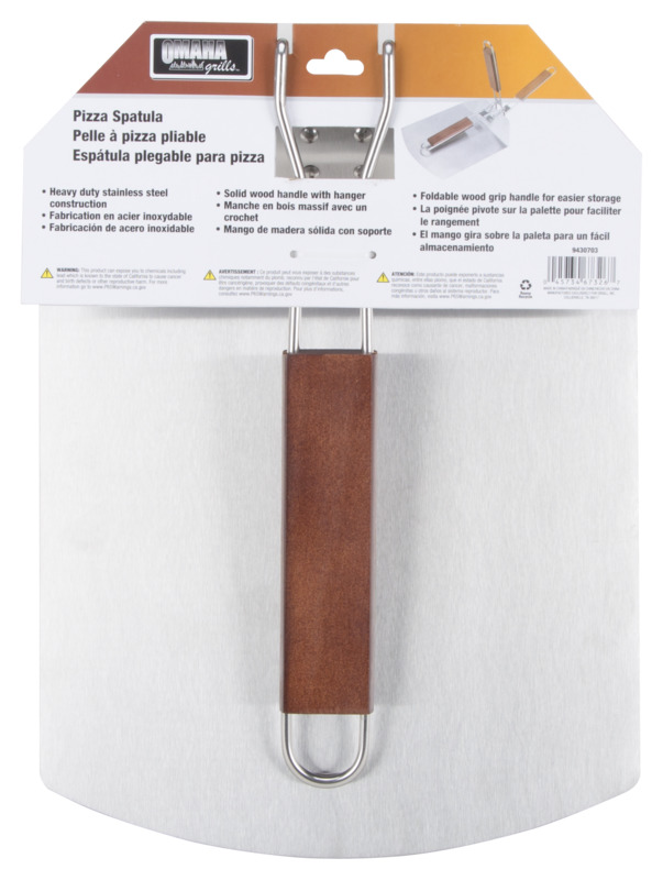 Heavy-duty stainless steel. Solid wood handle with hanger. Foldable wood grip handle for easier storage.
