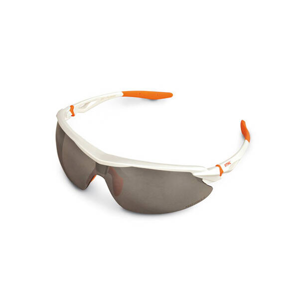 STIHL two-tone sport protective glasses offer wraparound protection in a sleek orange and white frame. These protective glasses block out 99% of harmful UV rays and feature an adjustable rubber nosepiece that prevents slippage. The frame features straight-back temples and rubber temple tips. The lenses are made from optical-grade polycarbonate.