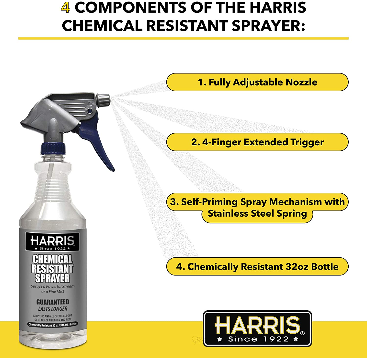 The Harris Chemical Resistant Sprayer's benefits include: Adjustable Nozzle - From a fine mist to a powerful stream, the sprayer can be easily adjusted to suit your needs; Chemically Resistant - The heavy duty 32 oz bottle and stainless steel spring are chemically resistant to hold up against harsh chemicals and solvents; 4 Finger Sprayer - An extended spray trigger allows for a better grip during extended periods of use; Pressurized - The sprayer automatically reloads after every use, preventing you from having to squeeze multiple times to prime; and Includes Measurements - Ounce measurements are listed on the bottle for your convenience. Four components of the Harris Chemical Resistant Sprayer: fully adjustable nozzle; 4-finger extended trigger; self-priming spray mechanism with stainless steel spring; and chemically resistant 32-oz bottle.