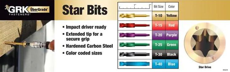 GRK Star Drive Bits provide six points of contact with our star drive head screws. The star drive helps to eliminate stripping for improved productivity.