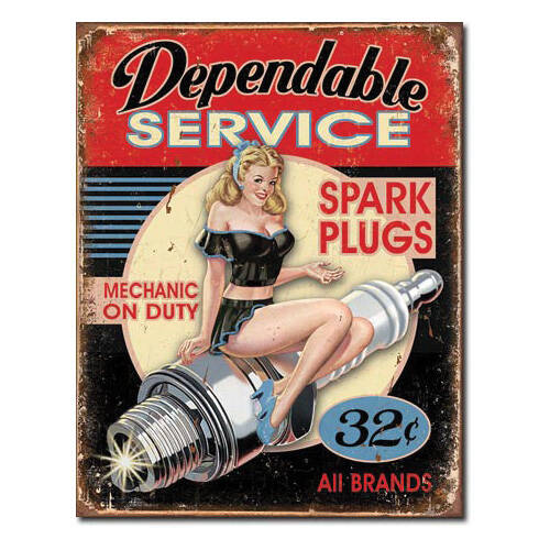 Desperate Enterprises Sign, Dependable Service, Dependable SERVICE- MECHANIC ON DUTY, SPARK PLUGS, Tin, 16 in H x 12-1/2 in W Dimensions