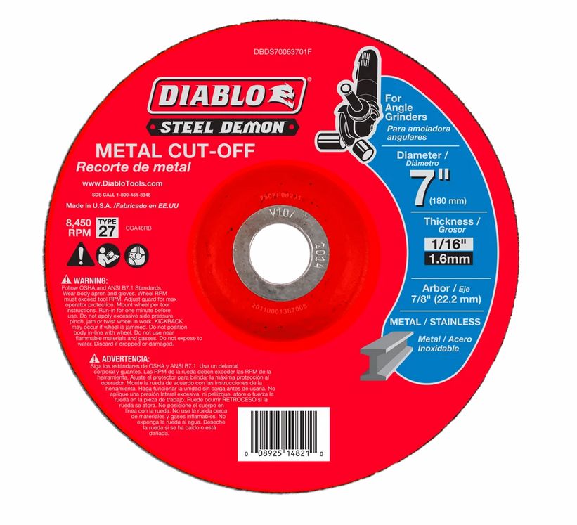 Diablo's Steel Demon metal cut-off discs deliver industrial performance, increased productivity and longer cutting life. Featuring a premium ceramic blend that produces quick cuts that deliver up to 6X longer life. A fully reinforced depressed center enables the disc to withstand heavy-duty metal applications such as heavy stock removal or blending. These discs are ideal for flush cuts and working in hard-to-reach areas.