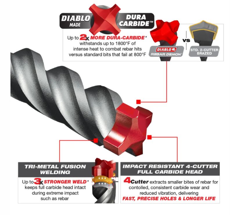 - Diablo made Dura-Carbide™ features up to 2X more carbide that withstands up to 1800°F of intense heat to combat rebar hits versus standard bits that fail at 800°F