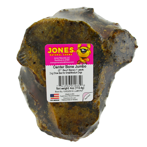 The 2 Jumbo Center Bone is larger than the 2 Center Bone and provides a wonderful chew for small to medium size dogs. These are USA natural bones with no artificial ingredients added. Most of these bones will contain some bone marrow and lots of meaty tidbits! The 2 Jumbo Center Bone is the bottom half of a crown knuckle. All Jones products are 100% grown and made in the USA.