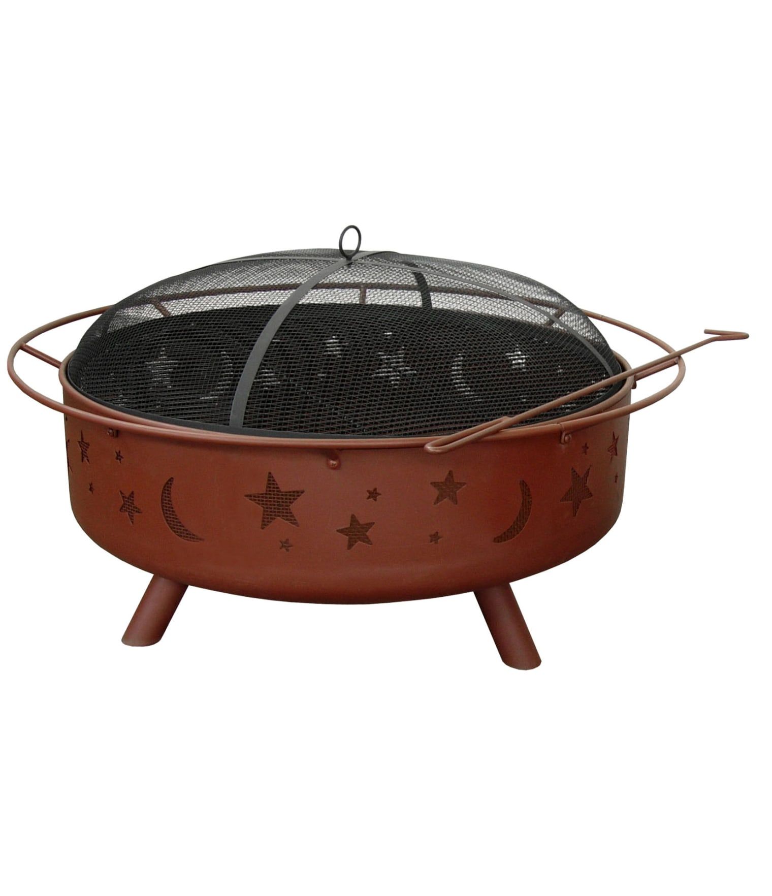 Star and moon cutouts for great fire views, Full circle handle and safety ring. Sturdy construction with three legs.