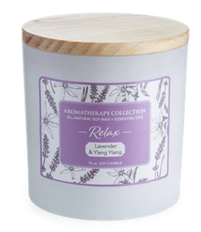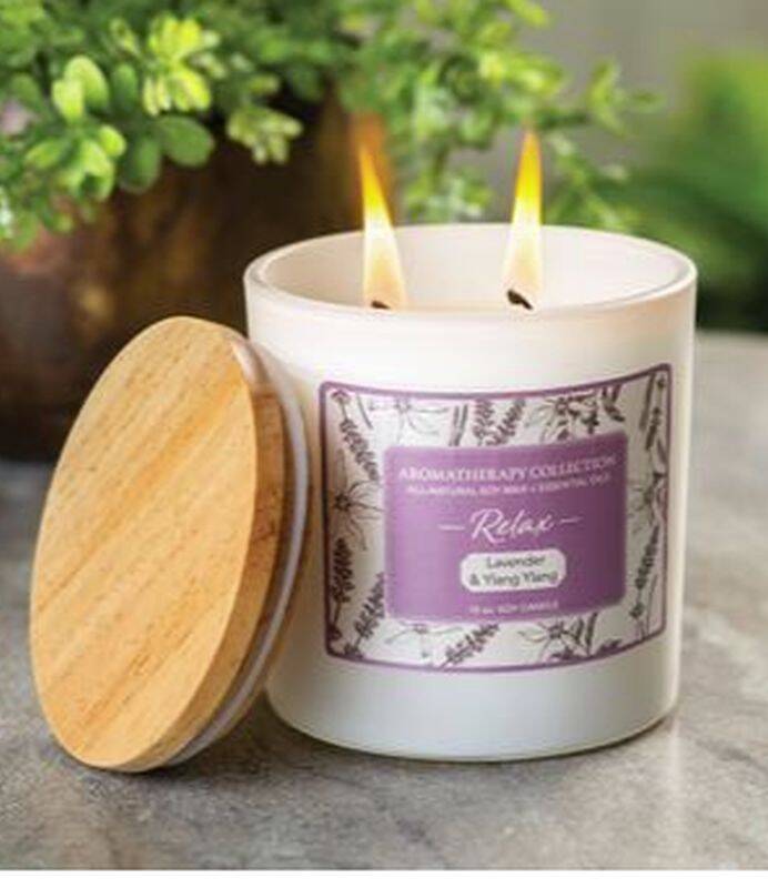 Double-wick Lavender and Ylang Ylang soy candle. Light both wicks to burn evenly, or use a Candle Warmers Etc Fragrance warmer to have the ambiance and fragrance of a lit candle without the flame.
