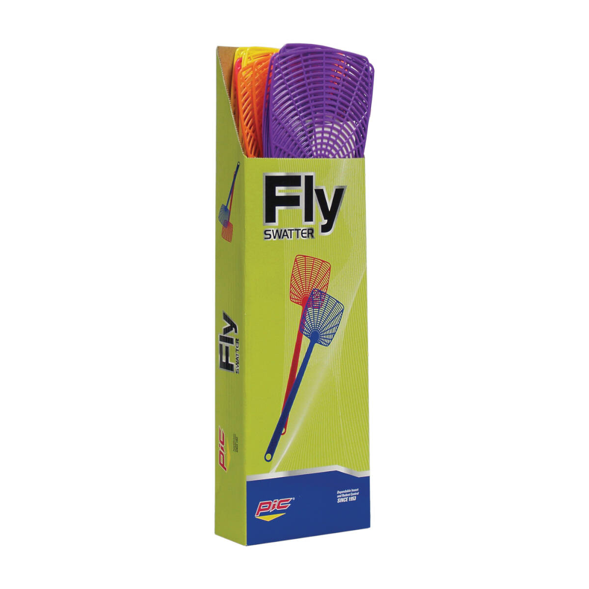 Flexible, plastic fly swatters in 4 assorted neon colors. Won't scratch surfaces or tear for long life. Basket weave design swatter size of 3-1/2 in x 5 in