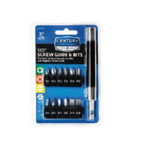 Century Drill & Tool Screw Guide and Bit Set, Steel, Pack, 13 -Piece, Includes: (1) #1 Phillips Insert Bit, (4) #2 Phillips Insert Bits, (1) #3 Phillips Insert Bit, (1) #1 Square Insert Bit, (3) #2 Square Insert Bits, (2) #8-10 Slotted Insert Bits, (1) 4-1/2 in Magnetic Screw Guide