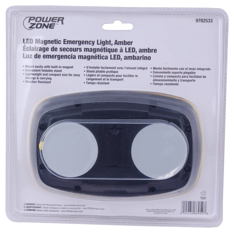The PowerZone magnetic emergency light(amber) is 45 lumens, beam distance: 30m, run time: 24 hrs, 2 modes: constant/strobe and it can be mounted easily with the built-in magnet. Because of it's lightweight, compact size and foldable stand makes it easy for storage. 4 AA batteries not included.