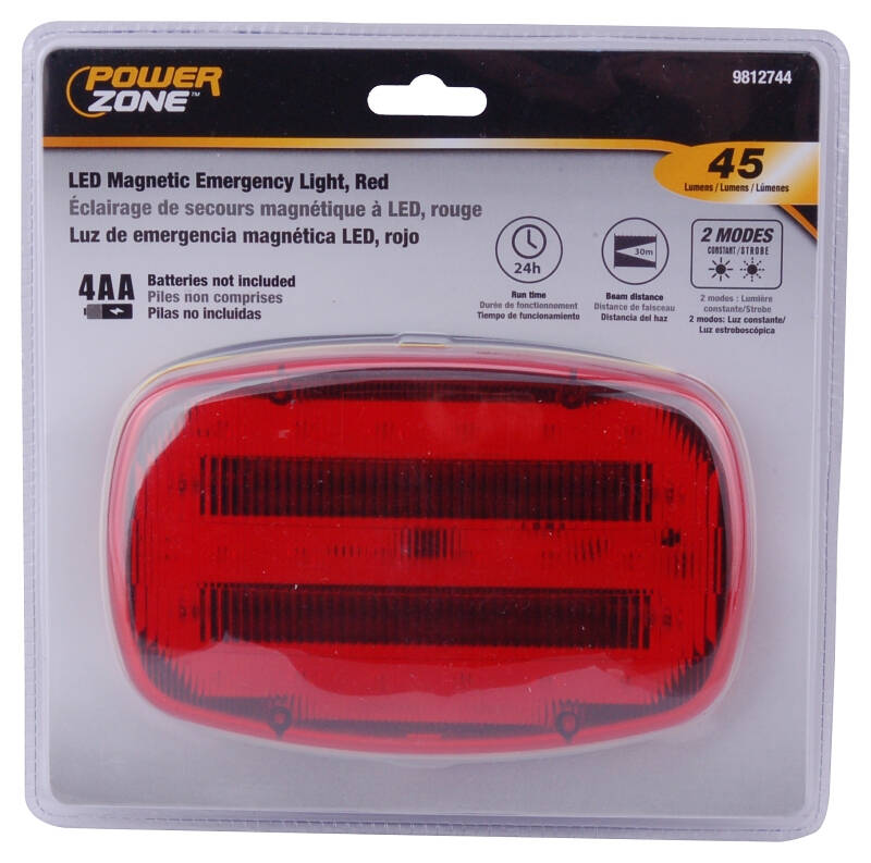 The PowerZone magnetic emergency light(red) is 45 lumens, beam distance: 30m, run time: 24 hrs, 2 modes: constant/strobe and it can be mounted easily with the built-in magnet. Because of it's lightweight, compact size and foldable stand makes it easy for storage. 4 AA batteries are included.