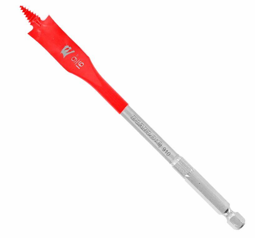 Diablo's SPEEDemon™ Spade Bit range provides one of the fastest, most effortless hole drilling solutions on the market for fast, clean wood. The high-performance SPEED-TIP design self-feeds for faster hole making when compared to traditional spade bits. An optimized Curved Paddle design enhances the chip evacuation process for more holes per charge. This range is Impact Strong™ for increased shank stability and durability in cordless and corded impact and drill drivers.