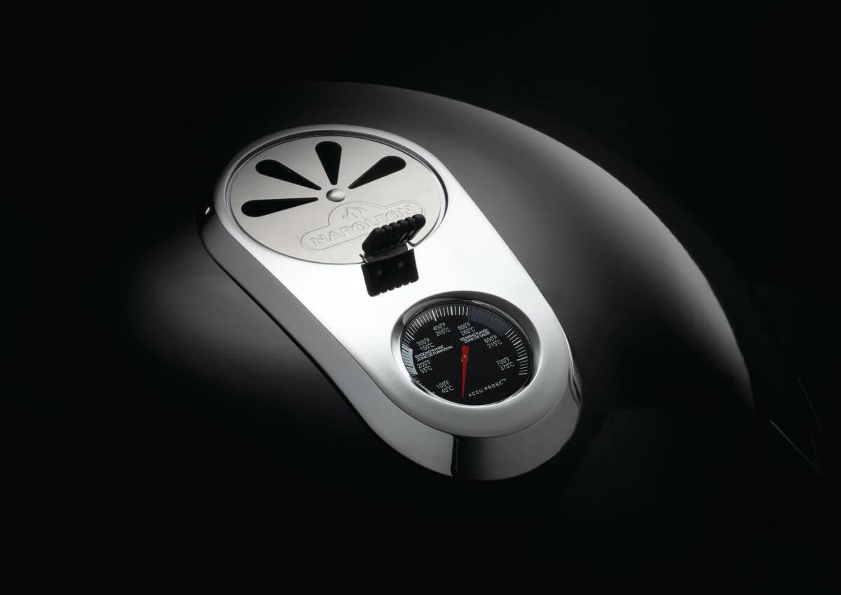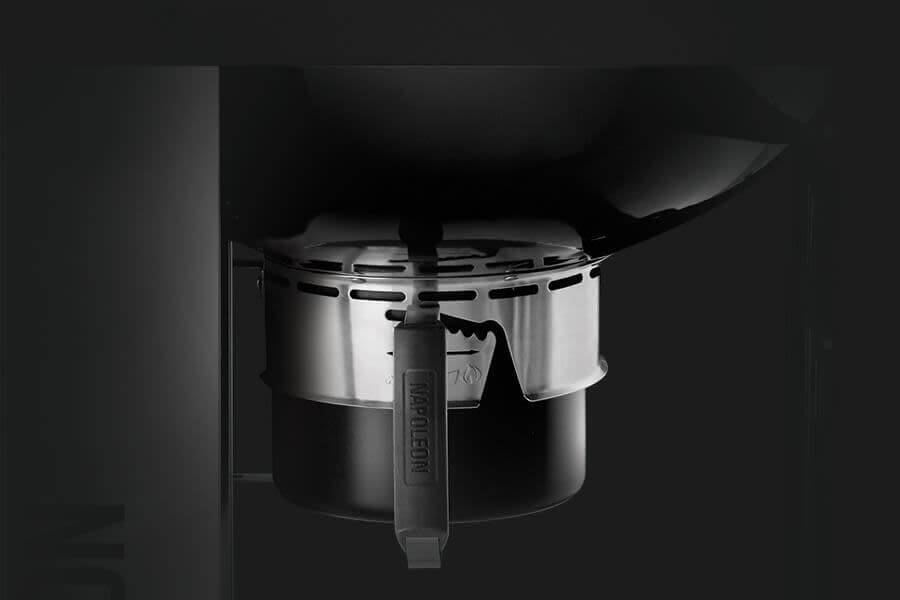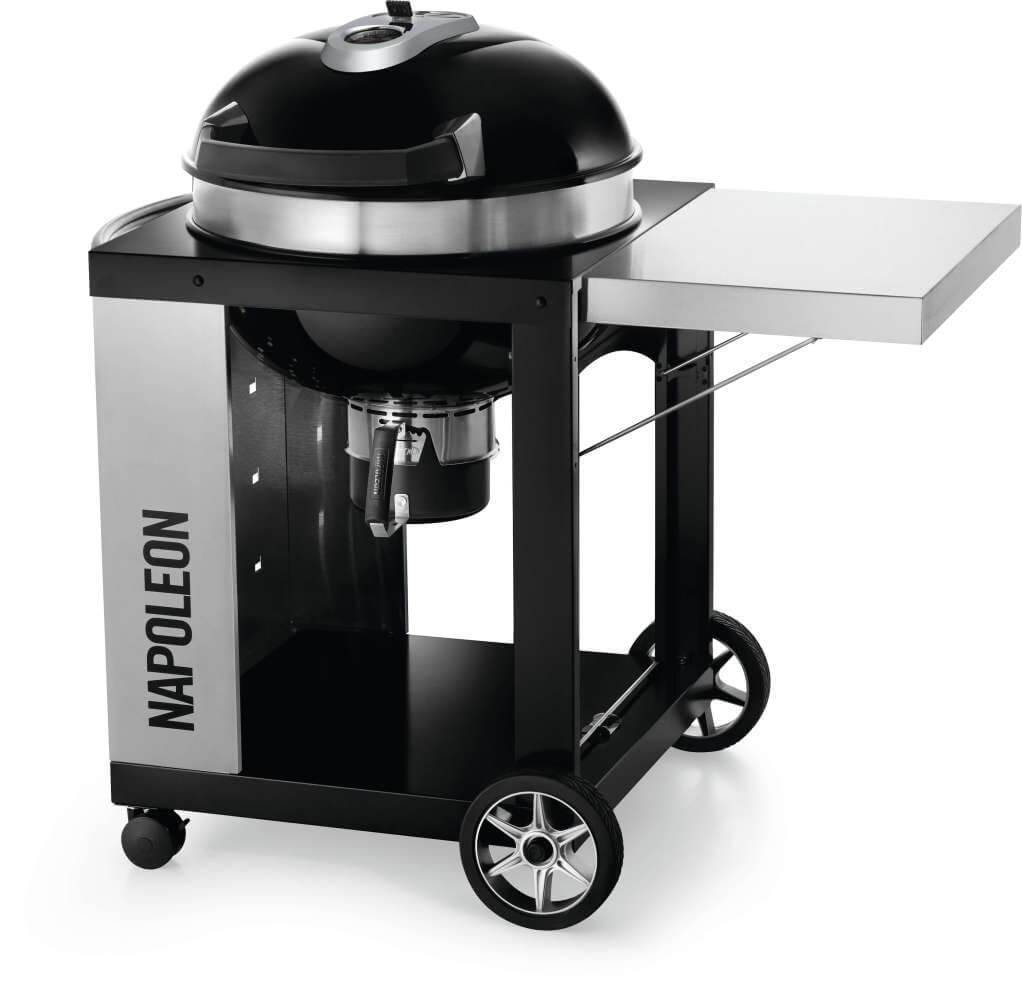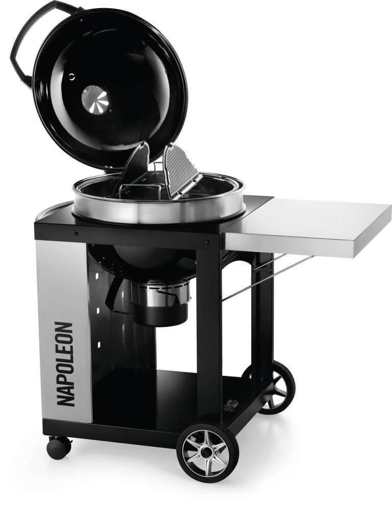 Charcoal enthusiasts can experience a full-sized grilling experience with the compact and mobile Napoleon PRO Charcoal Kettle Grill with Cart. The stainless steel, folding side shelf provides a generous prep space. The folding shelf isn't the only thing that is spacious, there is also the large, hinged, cast iron cooking grid. You'll know it's a Napoleon with the iconic WAVE™ cooking grids for those distinctive sear marks. Grilling, roasting, and smoking are a breeze, the hinged grids season like a cast iron frying pan, and make it easy to reload charcoal or add wood for smoking. Charcoal is all about controlling heat and airflow, the cooking grids adjust to three heights, while the stainless steel heat diffuser evenly distributes heat, and directing spent charcoal to the ash catcher. The lid features an offset hinge that opens, allowing access to the whole grill while keeping your hands away from the heat.