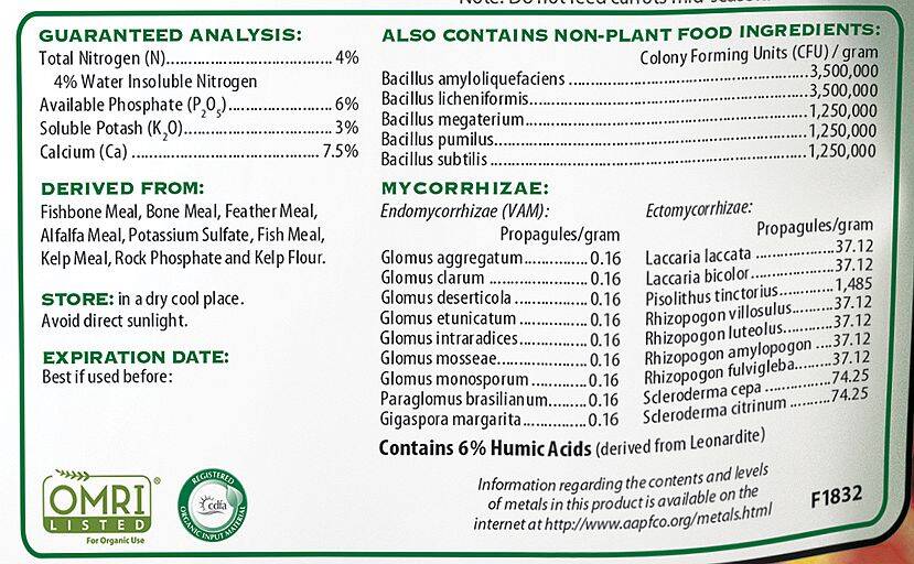 | Ingredients | Fishbone Meal, Bone Meal, Feather Meal, Alfalfa Meal, Potassium Sulfate, Fish Meal, Kelp Meal, Rock Phosphate, and Kelp Flour. ALSO CONTAINS NON-PLANT FOOD INGREDIENTS (Colony Forming Units ‘CFU’ / gram): Bacillus amyloliquefaciens 3,500,000; Bacillus licheniformis 3,500,000; Bacillus megaterium 1,250,000; Bacillus pumilus 1,250,000; Bacillus subtilis 1,250,000. MYCORRHAIZAE (Propagules/gram): ENDOMYCORRHIZAE (VAM): Glomus aggregatum 0.16; Glomus clarum 0.16; Glomus deserticola 0.16; Glomus etunicatum 0.16; Glomus intraradices 0.16; Glomus masseae 0.16; Glomus monosporum 0.16; Paraglomus brasilianum 0.16; Gigaspora margarita 0.16; ECTOMYCORRHIZAE: Laccaria laccata 37.12; Laccaria bicolor 37.12; Pisolithus tinctorius 1,485; Rhizopogon villosulus 37.12; Rhizopogon luteolus 37.12; Rhizopogon amylopogon 37.12; Rhizopogon fulvigleba 37.12; Scleroderma cepa 74.25; Scleroderma citrinum 74.25. Contains 6% Humic Acids (derived from Leonardite). |
