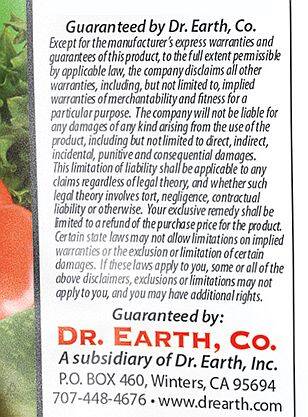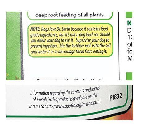 | Precautionary Statement | NOTE: Dogs love Dr. Earth because it contains food grade ingredients, but it’s not a dog food nor should you allow your dog to eat it. Supervise your dog to prevent ingestion. Mix the fertilizer well with the soil and water it in to discourage them from eating it. Information regarding the contents and levels of metals in this product is available on the internet at http://www.aapfco.org/metals.html |