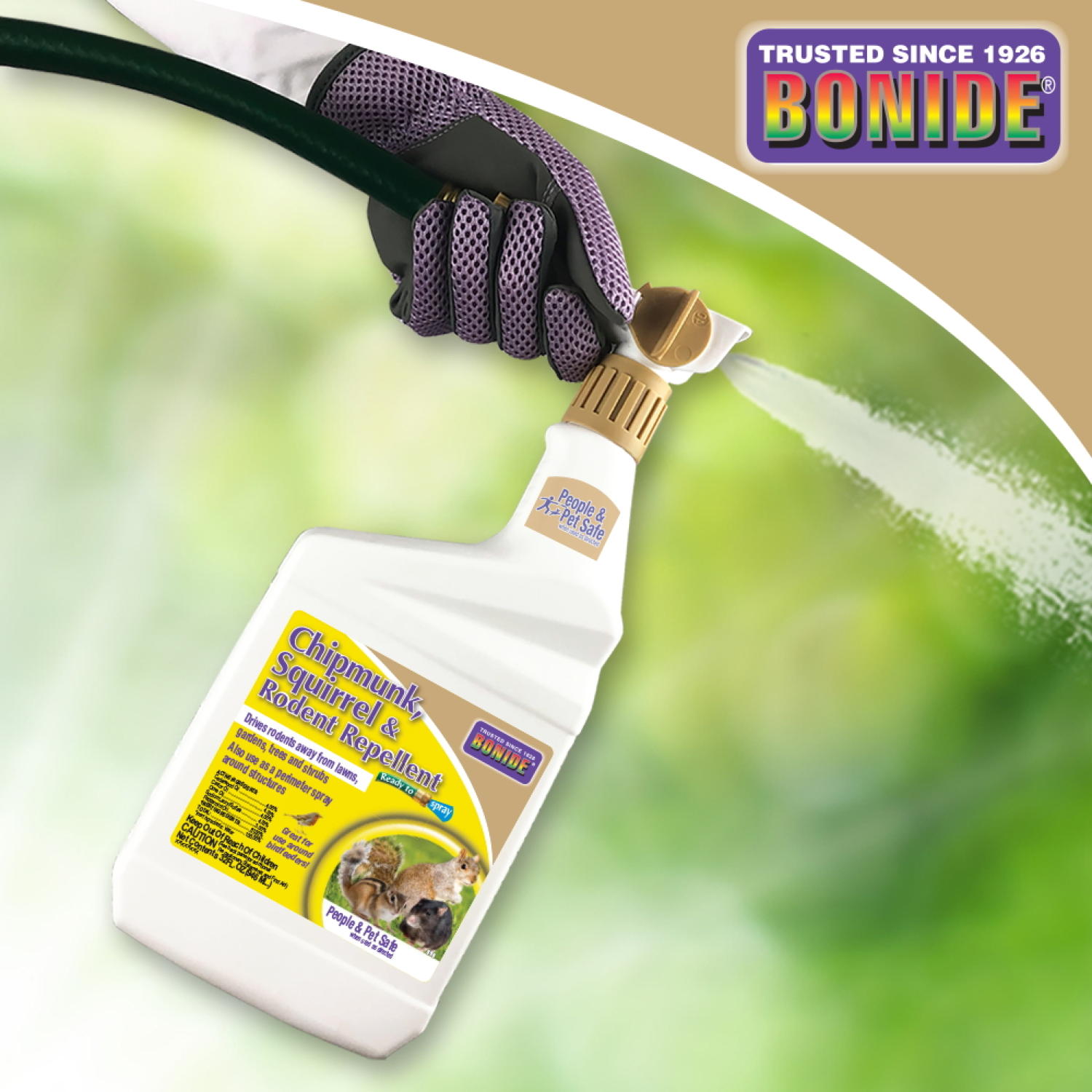 Deter chipmunks, squirrels, mice and rats from your lawn & garden with Bonide Chipmunk Squirrel and Rodent Ready-to-Spray Pest Repellent. A special blend of naturally derived ingredients and essential oils naturally repel rodents away from your yard. This product produces a powerful scent and taste that is naturally irritating to rodents, driving them away without causing harm to the animals.
