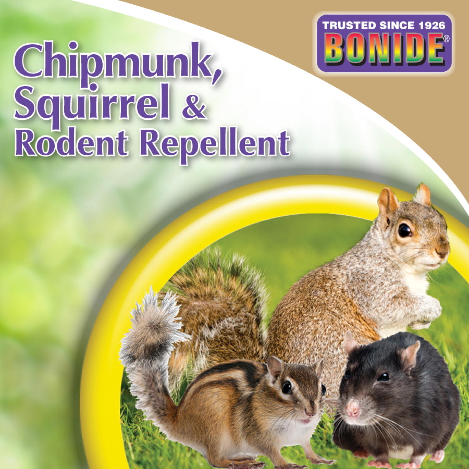 - Bonide Chipmunk, Squirrel & Rodent Repellent naturally repels animals from your yard and garden with natural ingredients that will not cause harm to the animals. Essential oils produce a strong taste and smell that are natural irritants to critters, deterring them from your outdoor space.