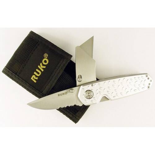 Dual Locking Liner Utility Folding Knife, 2-1/2-inch 50/50 serrated, razor sharp 420A stainless steel blade and replaceable utility blade. Anodized silver aluminum handle with non-slip diamond plate finish. Two-position ballistic nylon sheath with utility blade pouch, stainless steel pocket clip. Closed Length: 4-inch. Comes with 10 extra utility blade inserts.