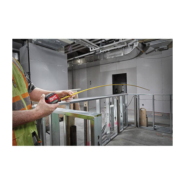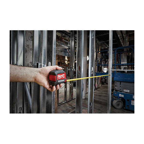 Our 16 ft compact wide blade magnetic tape measure has up to 15 ft of reach and a magnet that easily attaches to EMT and steel studs. The tape is wear and impact-resistant with nylon blade protection and an additional anti-tear coating on the first 6 in of the blade, reducing tape tear. Built-to-withstand the jobsite, the compact measuring tapes are constructed with a five-point reinforced frame for impact resistance.