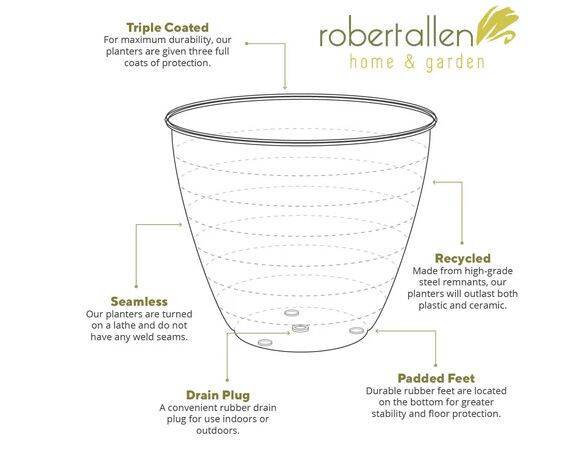 IronStone® is exclusive to Robert Allen and is lightweight - at nearly half the weight of ceramic, IronStone® makes plant chores a breeze. No more backaches! Eco-friendly IronStone® is created from excess heavy-gauge automotive steel, and it is indestructable! Nothing is worse than a plant accident. Don't get stuck picking up the pieces with ceramic pots. IronStone® can even survive being thrown off a roof! (Really!) This planter is beautiful enough for your living room, but durable enough for outdoors. The triple-coated glazed finish won't fade, chip or crack. IronStone® planters are made to last and are the #1 choice for your plants' health!