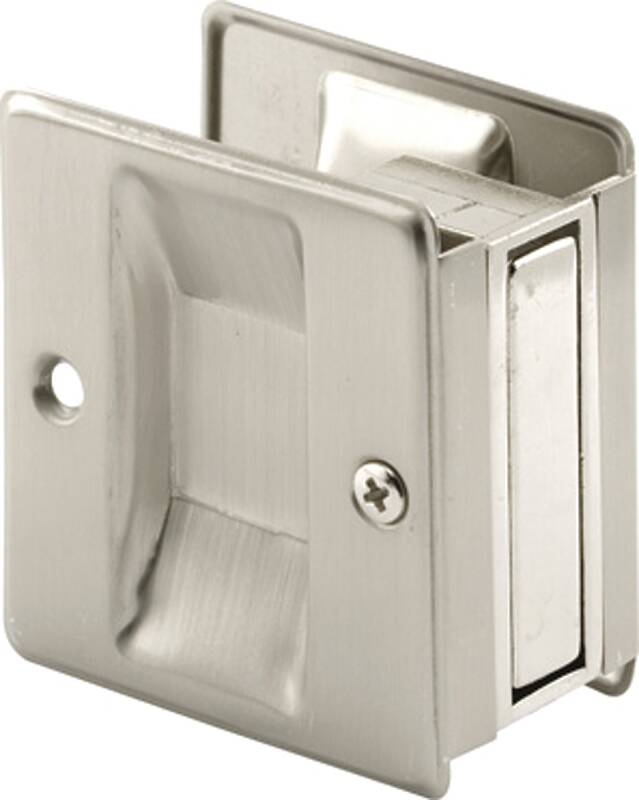 N 7238 is a solid brass pocket door pull with a satin nickel finish. It is 2-3/4 in tall and fits doors that are 1-3/8 to 1-3/4 in thick.