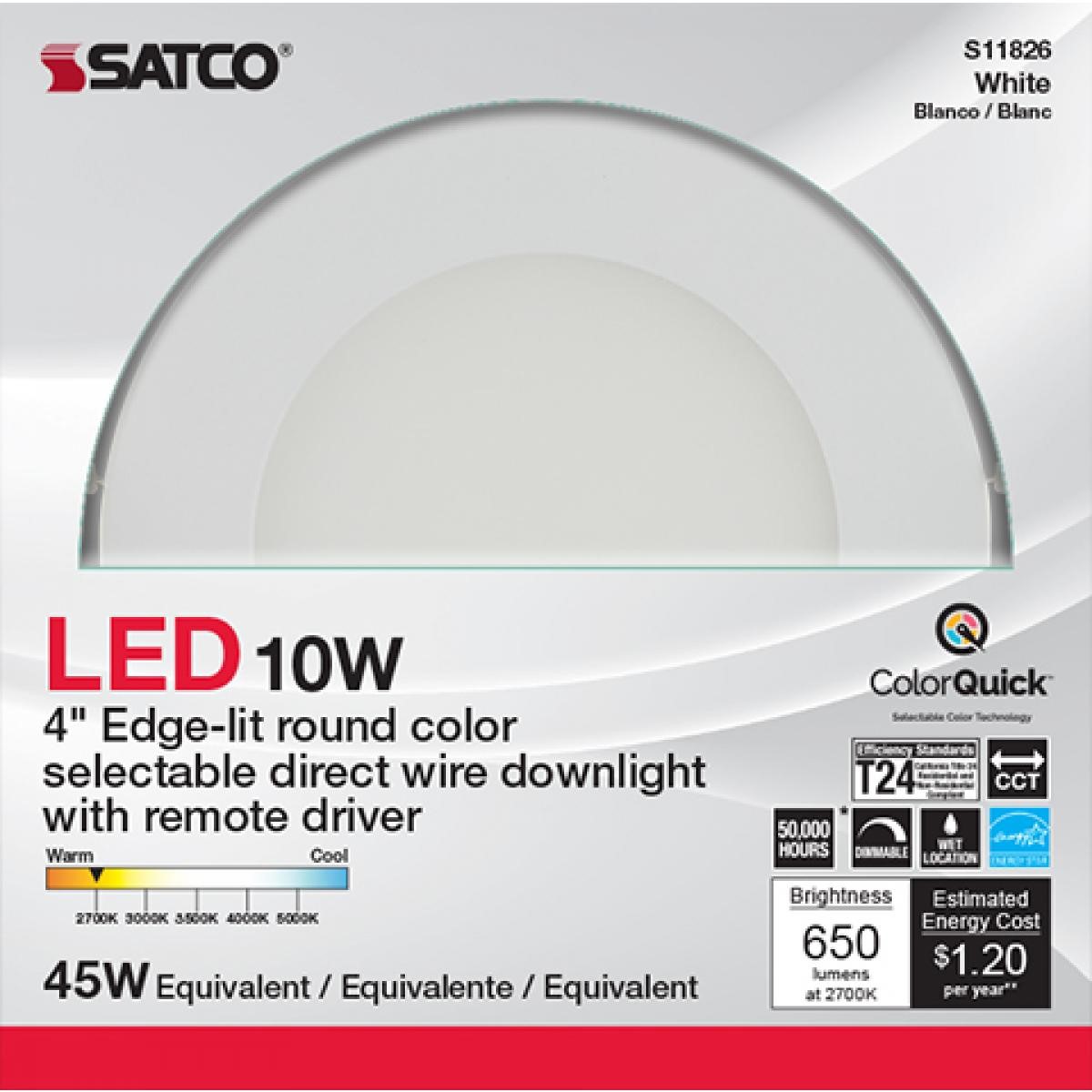 The ultra-slim profile of Satco's 10-watt lightweight remote driver downlight with selectable CCT delivers a maximum all-in-one advantage to any general recessed lighting solution. Wet location rated and requiring less than 1-inch ceiling clearance, the remote driver fits into shallow ceilings, cabinets, basements and more. With a fast clip for convenient placement, optional extender cable and rough in plates available, this recessed downlights work for both new and existing construction, is ENERGY STAR certified and complies with California Title 24.