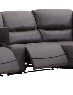 Fil the entire room with the reclining comfort of Plaza. This power sectional is large enough to seat all your family and friends with enough power options for everyone to enjoy. Revel with friends in the comfort of the extra-wide seating and extra-wide arms. The powered footrest operates with the touch of a button and the smoked grey fabric looks like suede and fits with many decors.