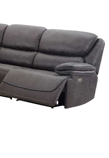 Fil the entire room with the reclining comfort of Plaza. This power sectional is large enough to seat all your family and friends with enough power options for everyone to enjoy. Revel with friends in the comfort of the extra-wide seating and extra-wide arms. The powered footrest operates with the touch of a button and the smoked grey fabric looks like suede and fits with many decors.