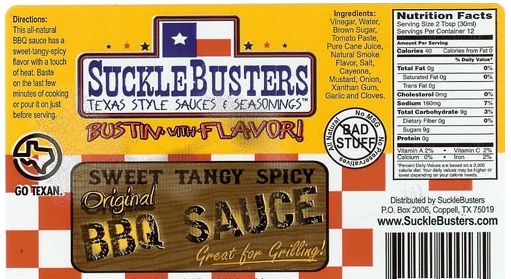 Gallon jug of the Best BBQ Sauce in Texas. SuckleBusters Award Winning Original BBQ Sauce. SuckleBusters Original BBQ Sauce wins 8 Major Awards from: Chile Pepper Magazine, Fiery Food Challenge, Best of the Best BBQ Sauce Contest, Scovie Awards, National BBQ Associations BBQ Sauce Contest and 2 Years running - 1st Place at the American Royal - World Series of BBQ Sauce Contest. SuckleBusters Original is the winningest BBQ Sauce in Texas! Our all-natural, vinegar based BBQ sauce is Sweet, Tangy & Spicy. It has very slightly smoke flavor plus a little kick of heat and is an excellent all-around BBQ sauce. Great for Grilling! Use it on barbecue beef, briskets, steaks, ribs, chicken, sausage, pork, seafood, turkey or any grilled food to bust out a good barbecue flavor. Baste it on during the last few minutes of grilling to create a sticky-sweet layer of barbecue flavor or pour it on just before serving. It makes a great dipping sauce and kids love it too! This is the best BBQ Sauce made in Texas. Ingredients: Vinegar, water, brown sugar, tomato paste, pure cane sugar, natural smoke flavor, salt, spices, xanthan gum. NO MSG. Naturally Gluten Free.