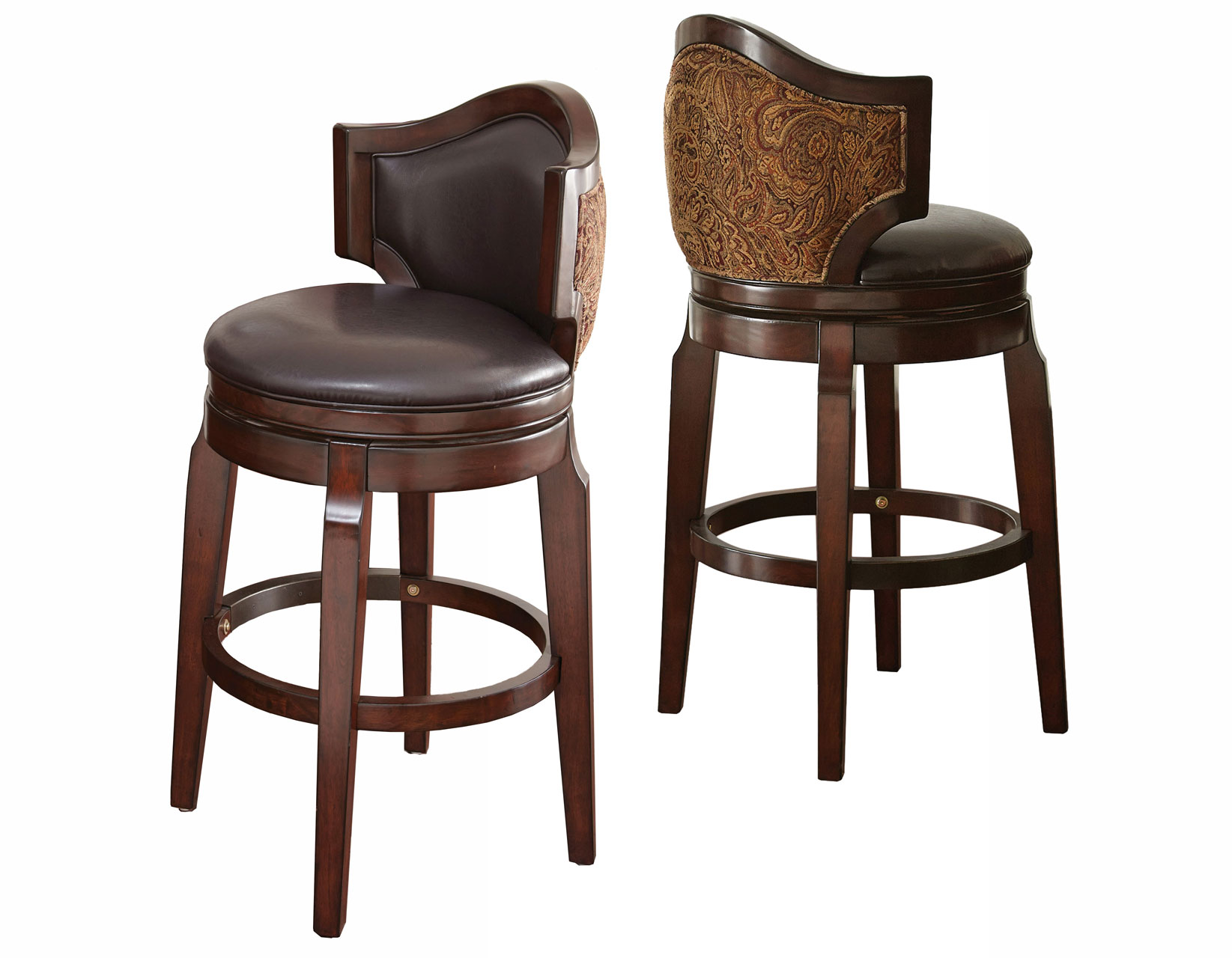 Sometimes you just need a classic . A pair of handsome devils, these bar chairs are crafted of wood with faux leather upholstery. But what youll really love are the decorative backs, which feature a timeless paisley print. Swivel seats complete the design, which is ideal for everything from a den to a home bar to a kitchen.