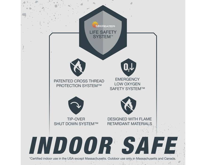 The 11,000 BTU High Performance, Omni-Directional Mesh Burner provides high intensity radiant heat in a full 180° spread so everyone can enjoy the warmth! With integrated gas powered accessory controls and a quick connect accessory rail system, you're safe and ready to go in any weather conditions and any event! Mr. Heater®'s Trusted - Advanced Safety Detection Systems, including; Emergency Low Oxygen Safety System, Apex 50° Tip-Switch and Thermal Shut-Down System, you and your family are safe.