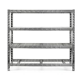 Storage unit is fast and easy to assemble at home, and does not require tools. The welded steel frame features four metal shelves that can support up to 2,000 lbs. each, and the dual slot profile allows for additional supports and shelves.